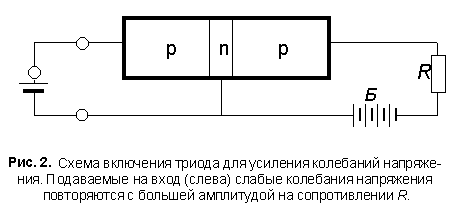 Триод р—n—р типа состоит из трёх областей, крайние из которых обладают дырочной проводимостью, а средняя — электронной. К этим трём областям триода делаются самостоятельные контакты а , б и в , что позволяет подавать разные напряжения на левый р—n-переход между контактами а и б и на правый n—р-переход между контактами б и в . Если на правый переход подать обратное напряжение, то он будет заперт и через него будет протекать очень малый обратный ток. Подадим теперь прямое напряжение на левый р—n-переход, тогда через него начнёт проходить значительный прямой ток. Одна из областей триода, например левая, содержит обычно в сотни раз большее количество примеси р-типа, чем количество n-примеси в n-области. Поэтому прямой ток через р—n-переход будет состоять почти исключительно из дырок, движущихся слева направо. Попав в n-область триода, дырки, совершающие тепловое движение, диффундируют по направлению к n—р-переходу, но частично успевают претерпеть рекомбинацию со свободными электронами n-области. Но если n-об-ласть узка и свободных электронов в ней не слишком много (не ярко выраженный проводник n-типа), то большинство дырок достигнет второго перехода и, попав в него, переместится его полем в правую р-область. У хороших триодов поток дырок, проникающих в правую р-область, составляет 99% и более от потока, проникающего слева в n-область. Если при отсутствии напряжения между точками а и б обратный ток в n— р-переходе очень мал, то после появления напряжения на зажимах а и б этот ток почти так же велик, как прямой ток в левом переходе. Таким способом можно управлять силой тока в правом (запертом) n—р-переходе с помощью левого р—n-перехода. Запирая левый переход, мы прекращаем ток через правый переход; открывая левый переход, получаем ток в правом переходе. Изменяя величину прямого напряжения на левом переходе, мы будем изменять тем самым силу тока в правом переходе . На этом и основано применение р—n—р-триода в качестве усилителя.